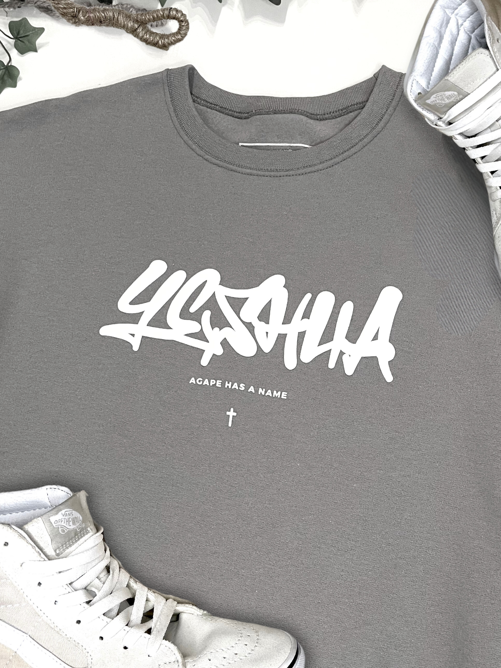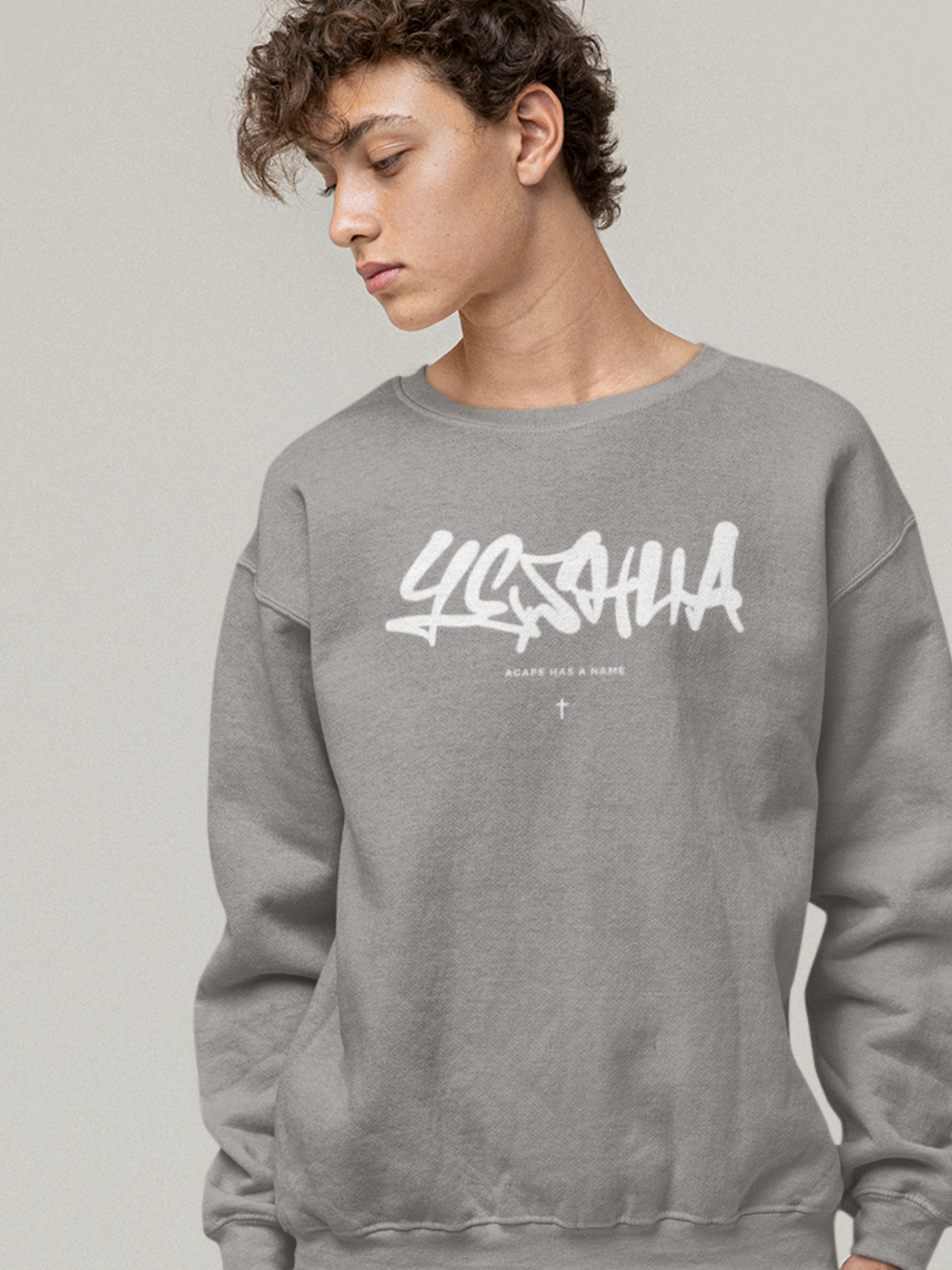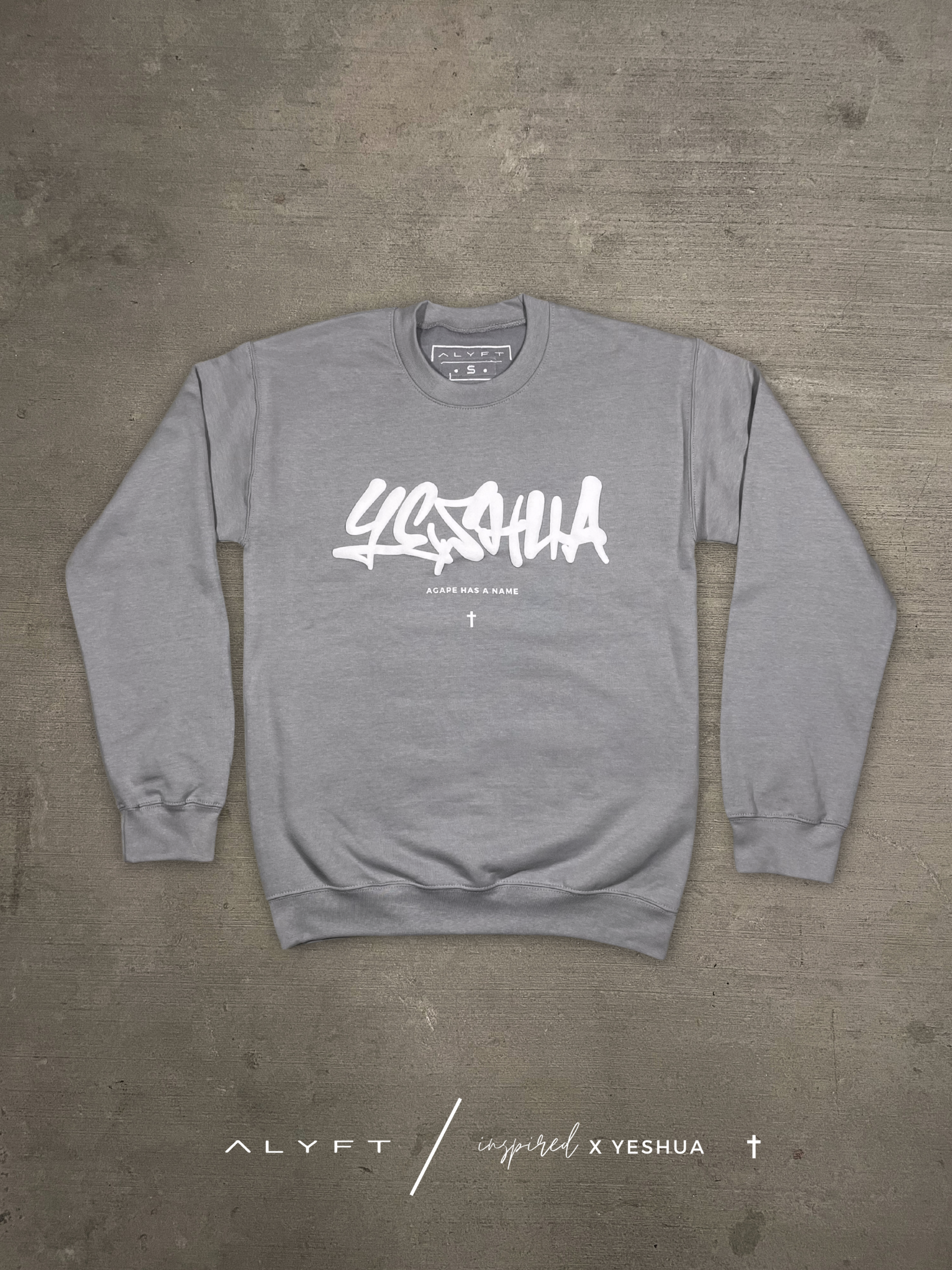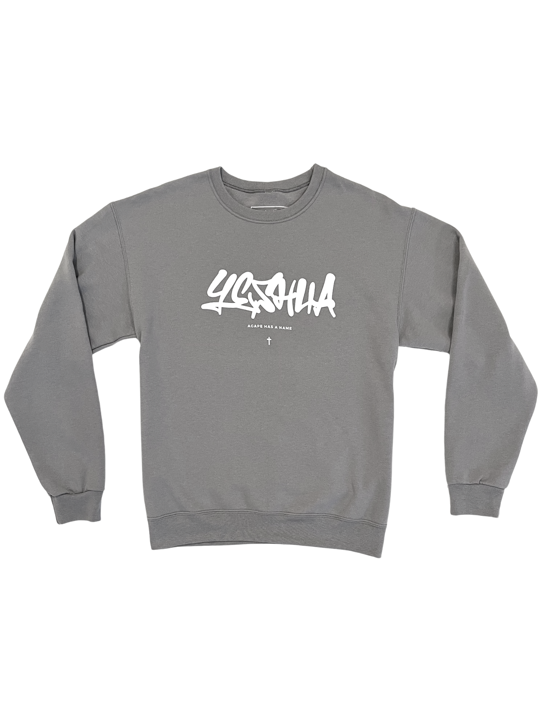 YESHUA x AGAPE - Professional puff print on front Yeshua design. Granite gray colorway on a premium midweight crewneck sweater. Read sizing tips below. There is a love that is the highest form, that is unconditional and would lay it's life down for you on the cross, that's agape love - the love of Jesus. Proclaim to the world that agape has a name - it's YESHUA. Yeshua is Jesus' name in Hebrew, which is the original language of the Bible - Old Testament.