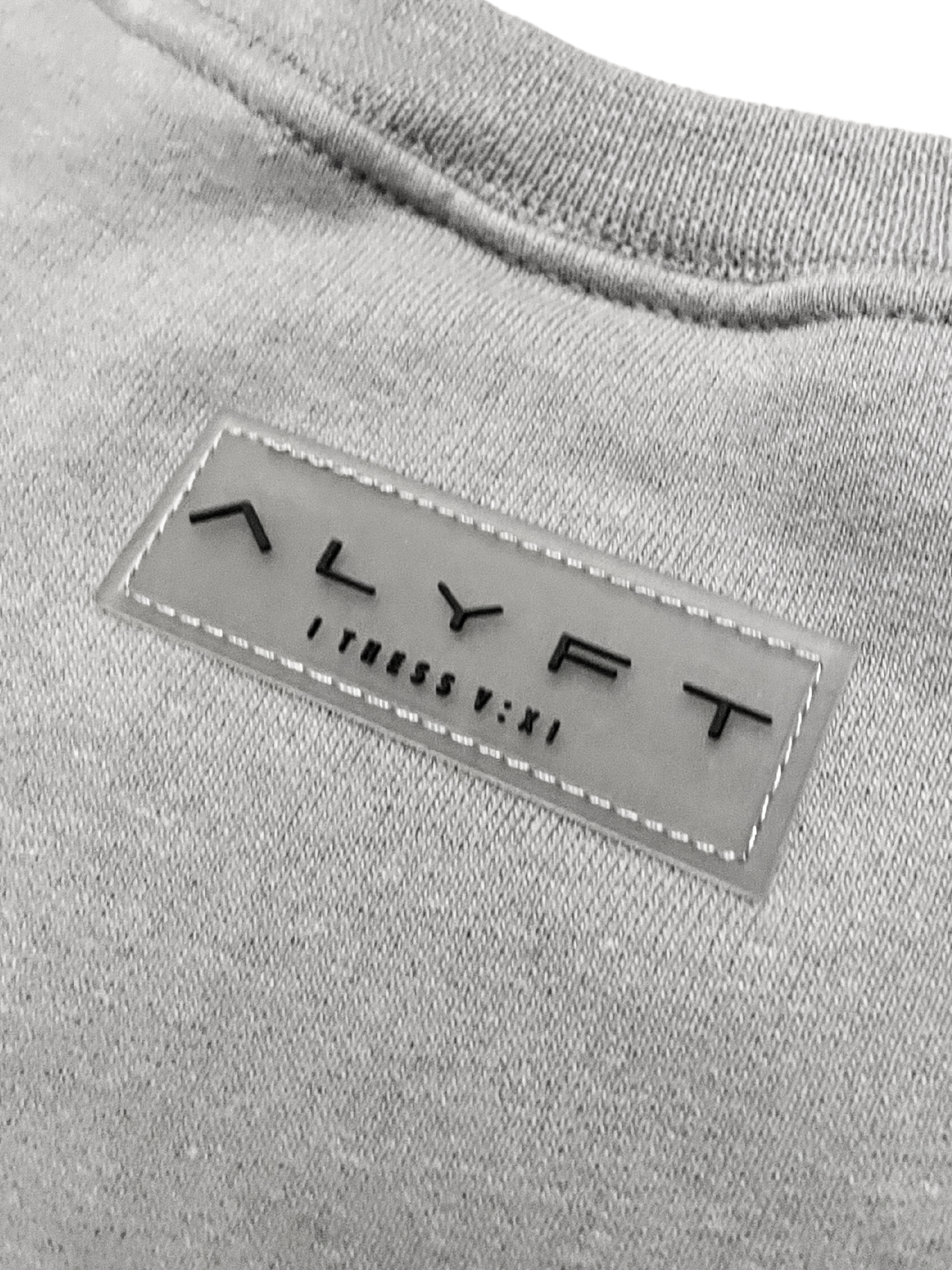 ALYFT premium custom, rubber patch on back of sweater with our signature company bible verse: 1 Thessalonians 5:11 - "Encourage one another and build each other up." Patch provides next level quality with raised lettering secured with professional stitching.