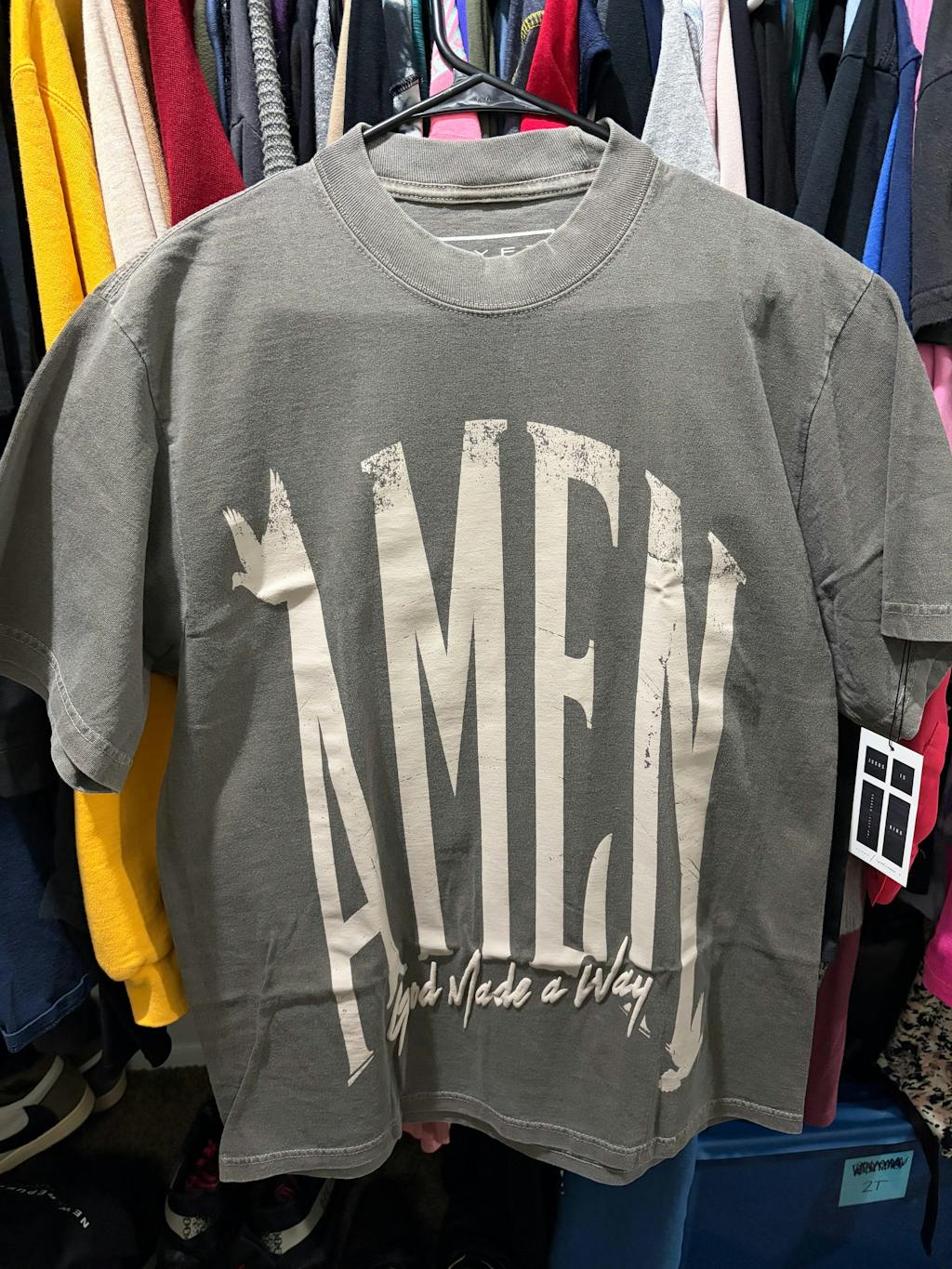 AMEN (GOD MADE A WAY) - Top tier, heavyweight 100% cotton unisex vintage tee. Retro vintage garment dye, cement colorway fabric with ivory-tan ink. Front design has a soft-to-touch finish with an AMEN oversized, distressed design with puff print for "God Made a Way." The back design, has key events in the Bible where God has made a way when there was no way. Slightly oversized tee with drop shoulder and longer sleeve.