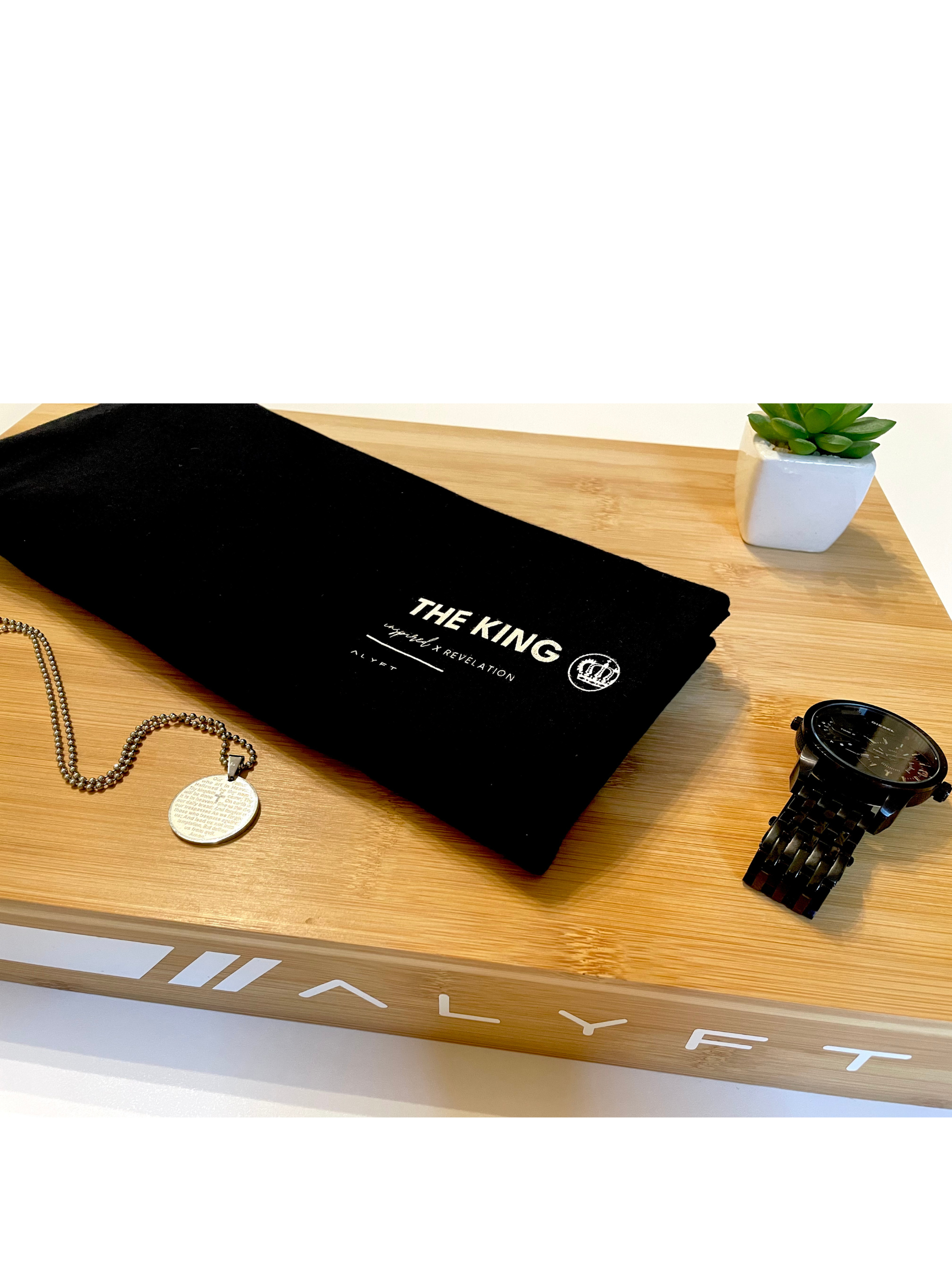 THE KING (ABOVE ALL) - This piece highlights a back tee design showcasing the "King of Kings" graphic with the verse: "And He has on His robe and on His thigh a name written: King on kings and Lord of lords" - Revelation 19:16.