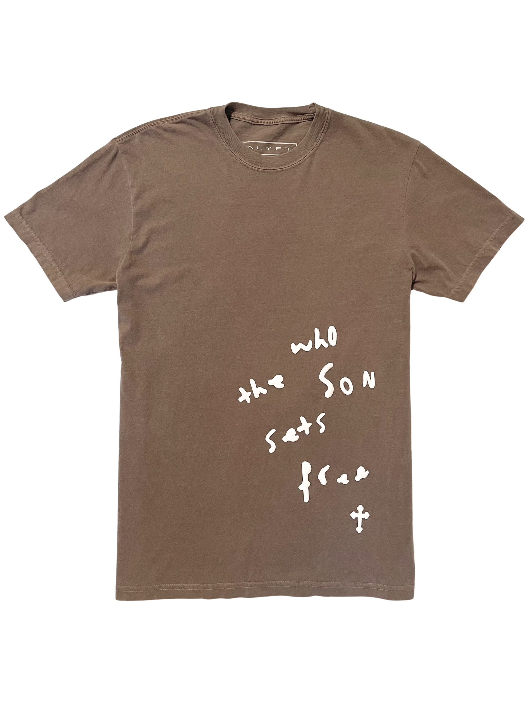 WHO THE SON SETS FREE - Is free indeed (John 8:36).  Industry top, garment dyed fabric with pro puff print front design. The back design showcases LOVE in sign language and there is no greater love than Jesus' love for us on the cross.  The sign of love existed well before the devil tried to imitate God and take out the thumb to make horns and shortchange God's sign of love.  Teach the world with this conversation starter.  This Christian art piece is an homage to Jesus as we thank Him for showing us the definition of agape, sacrificial love. Remember, the wages of sin is death, and the only way we make it to heaven is by a spotless sacrifice which we could not provide - but Jesus could.  We were supposed to pay for our sins at judgment and be condemned as we are all sinners, however Someone LOVES YOU that much to give their life on the Cross so that your sins would be wiped clean for you to enter Heaven.  Jesus did that supernaturally for us once and FOR ALL if we believe in Him and choose to walk with Him in all our ways.