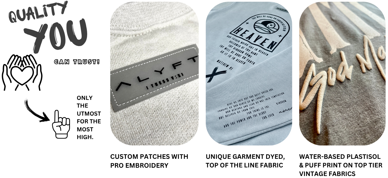We use garment dyed collection pieces that have a vintage look and feel on many of our items, this process produces a premium product. We have custom patches with raised lettering and professional embroidery. Our screen prints have water-based plastisol ink which provides a finish that is fused into our vintage tees instead of on top - essentially eliminating that caked on, rough to the touch style of print. After the first wash, you'll feel the difference as the design is smooth to the touch and embedded into the fabric permanently eliminating any issues of designs cracking over time. From fabric labeling, to care packaging, to creative photography and editing - the details of quality are undeniable. This is the art and meticulous detail of faith on fabric - ALYFT!