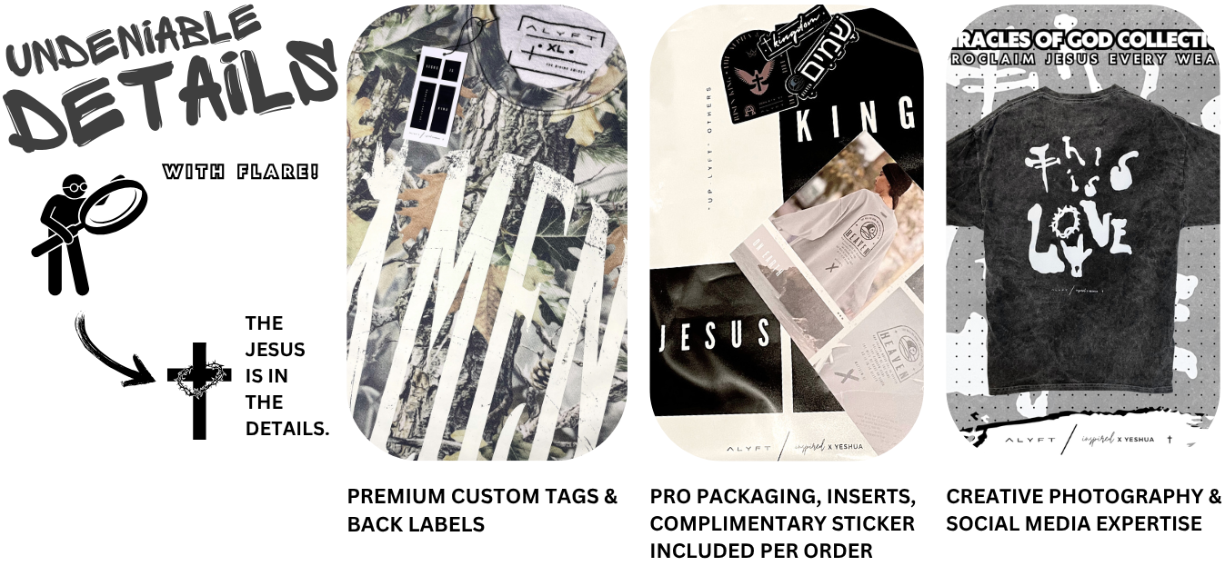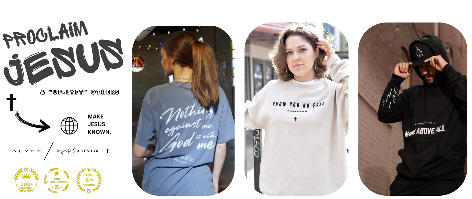 Hi fellow believer in Christ! Thank you for being right here in this moment with ALYFT. You're here not just because of the clothing designs, but because the apparel messages spoke to your faith and testimony, am I right? You saw a design here that will catch eyes and will allow you to spread the gospel through what you wear every day. We design clothes for you to spark conversation on faith and to help you be a billboard for Jesus everywhere. Our aim in glorifying the Most High was to choose materials that were the highest quality and to execute on the highest level to honor the name of Jesus for He is worthy of all our efforts!